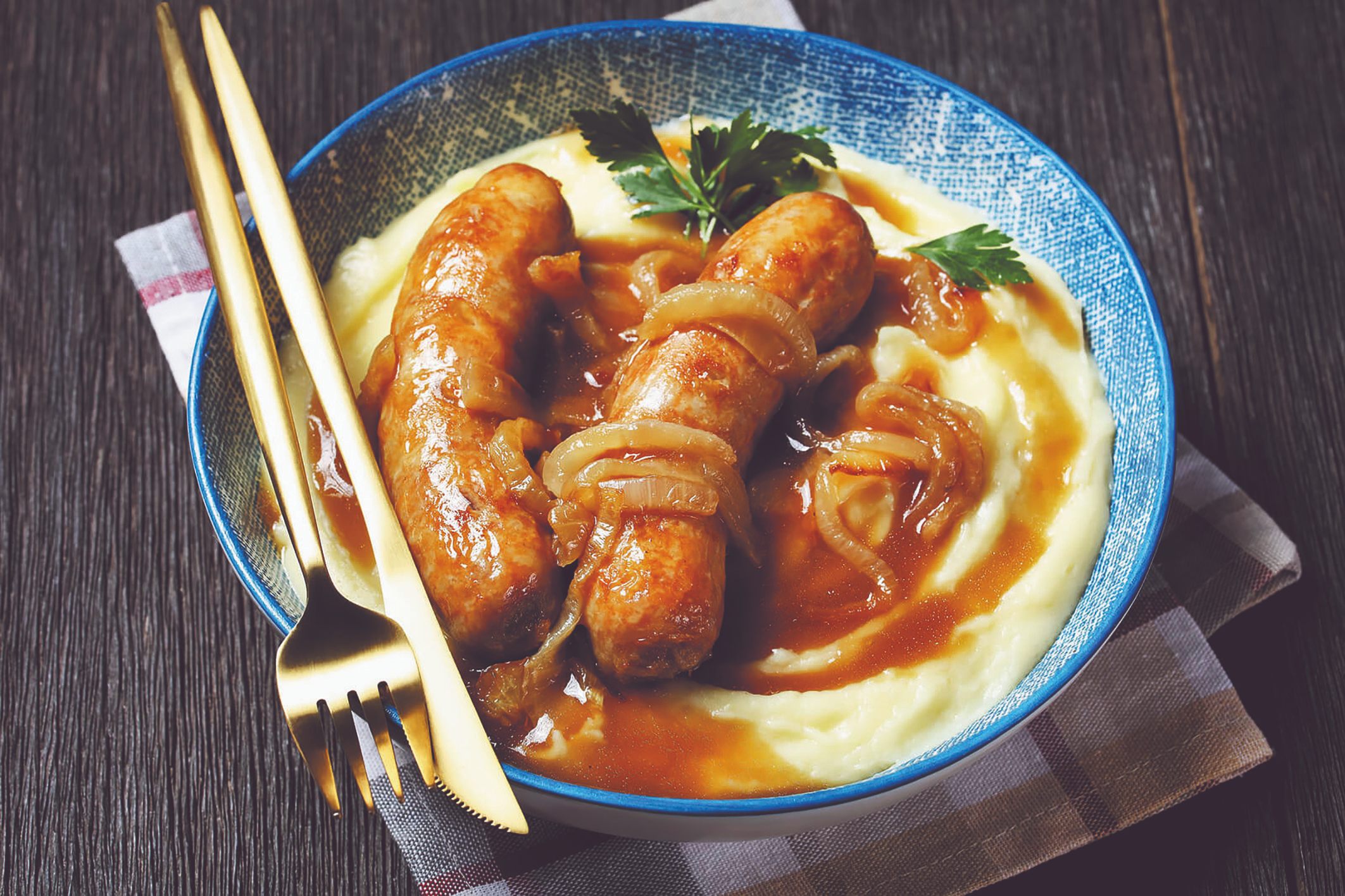 Juicy Pork Sausages in a Rich Onion Gravy.